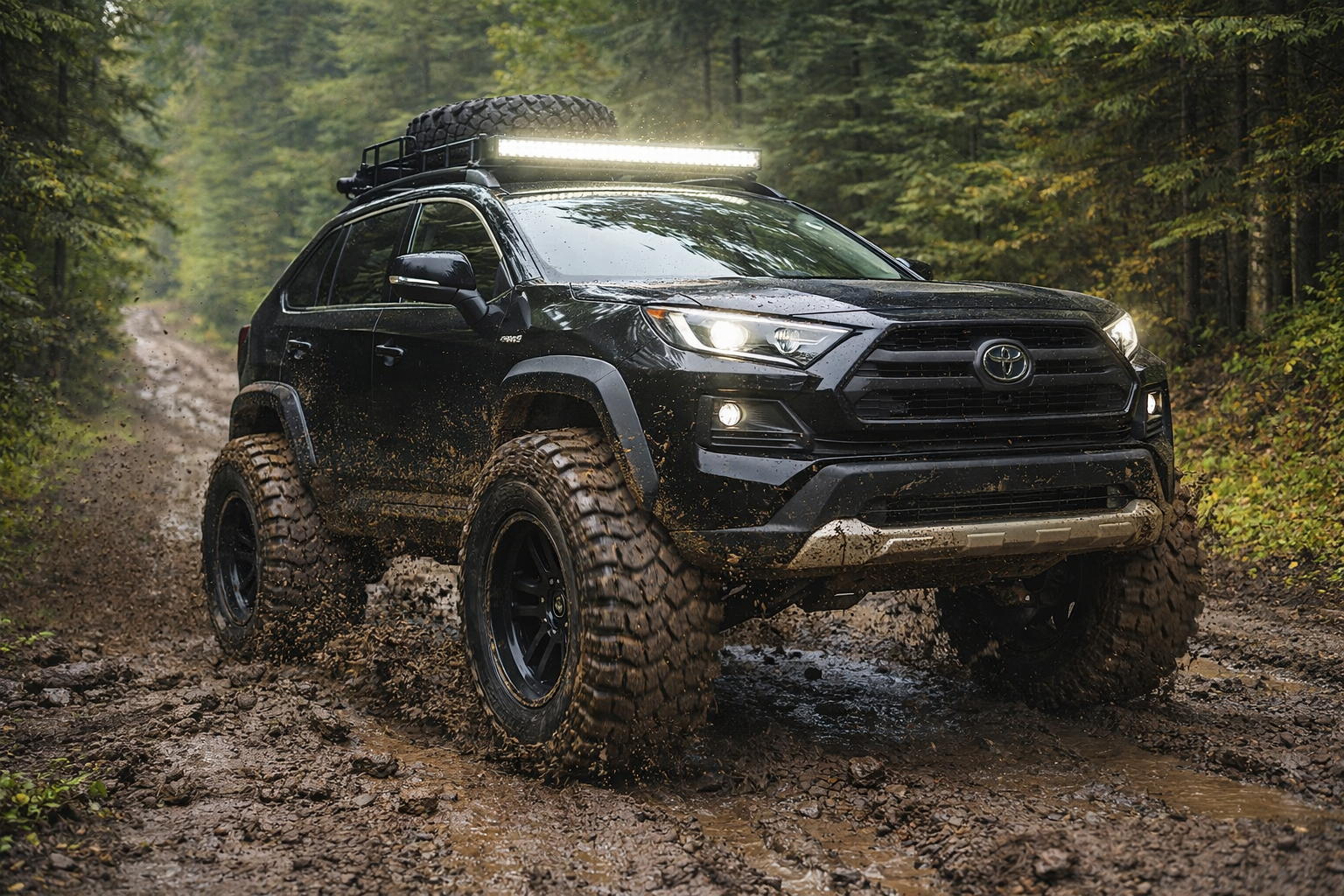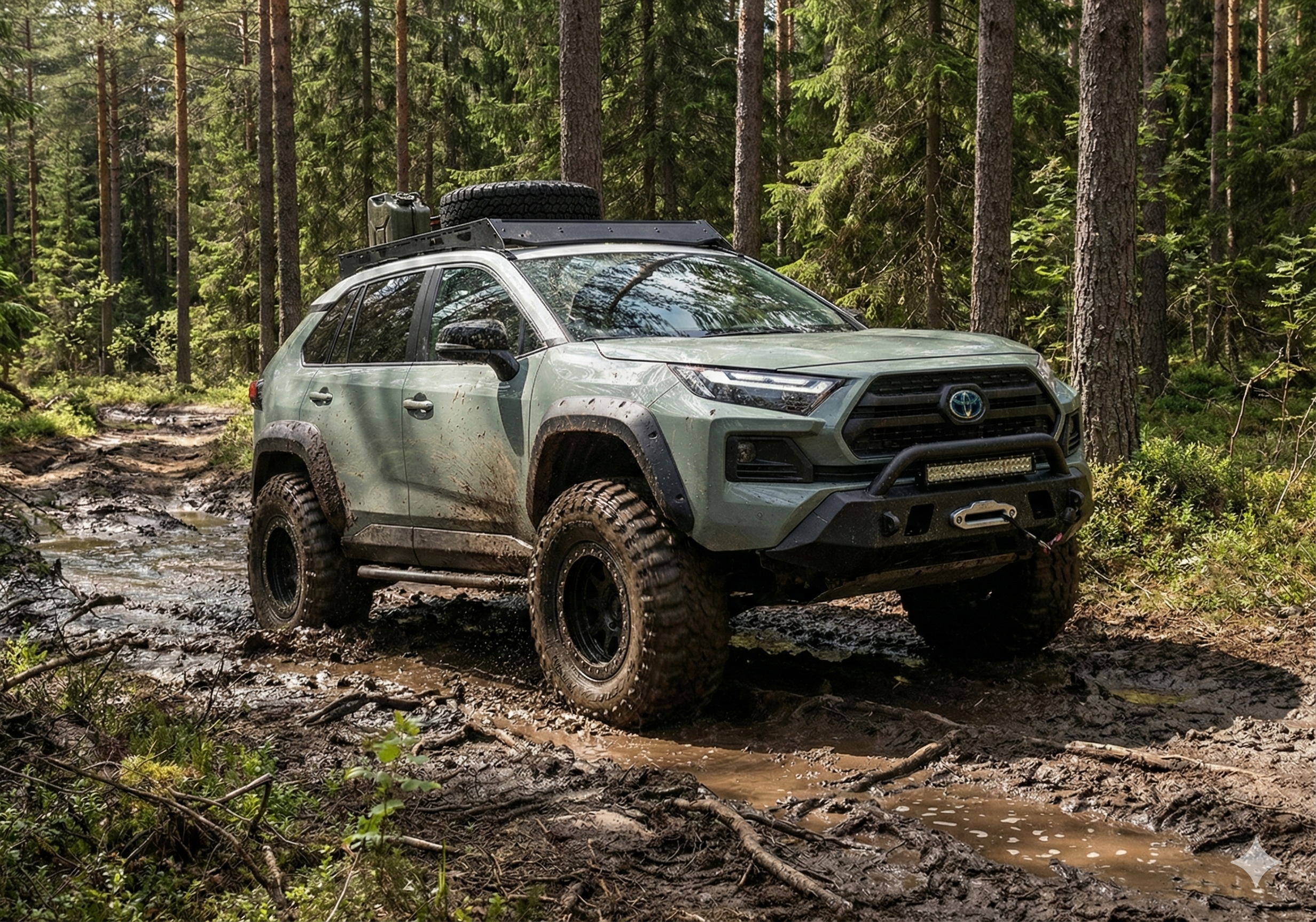RAV4 poznáme ako spoľahlivé rodinné SUV, ktoré zvládne štrk, sneh aj poľnú cestu. My sme však zašli o pár krokov ďalej. Obrovské offroadové kolesá, zdvihnutý podvozok, blato všade navôkol a lesná cesta, kde by ste bežne skôr stretli traktor než hybrid.